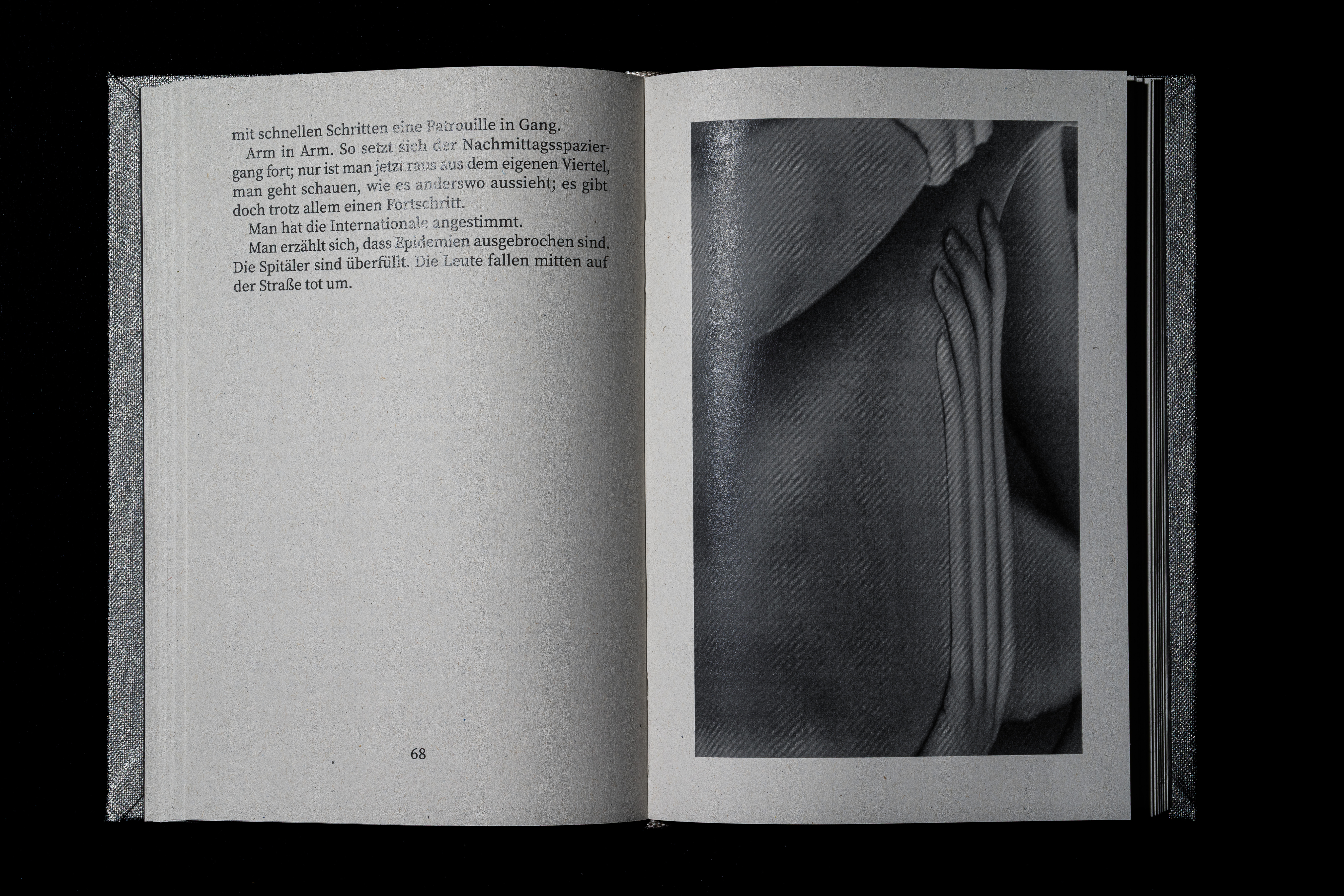 A book design for the novel Sturz in die Sonne (Crash into the sun). The personal interpretation of the story is conveyed through photography, typography, cover design and bookbinding. This is intended to subconsciously create a mysterious atmosphere for the reader.